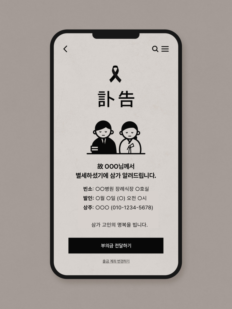 가족이나 가까운 분의 별세 소식을 알리는 공식적인 통지입니다. 예전에는 신문이나 벽보 형태로 알렸지만, 요즘은 문자, SNS, 카카오톡 등으로 많이 알립니다.
